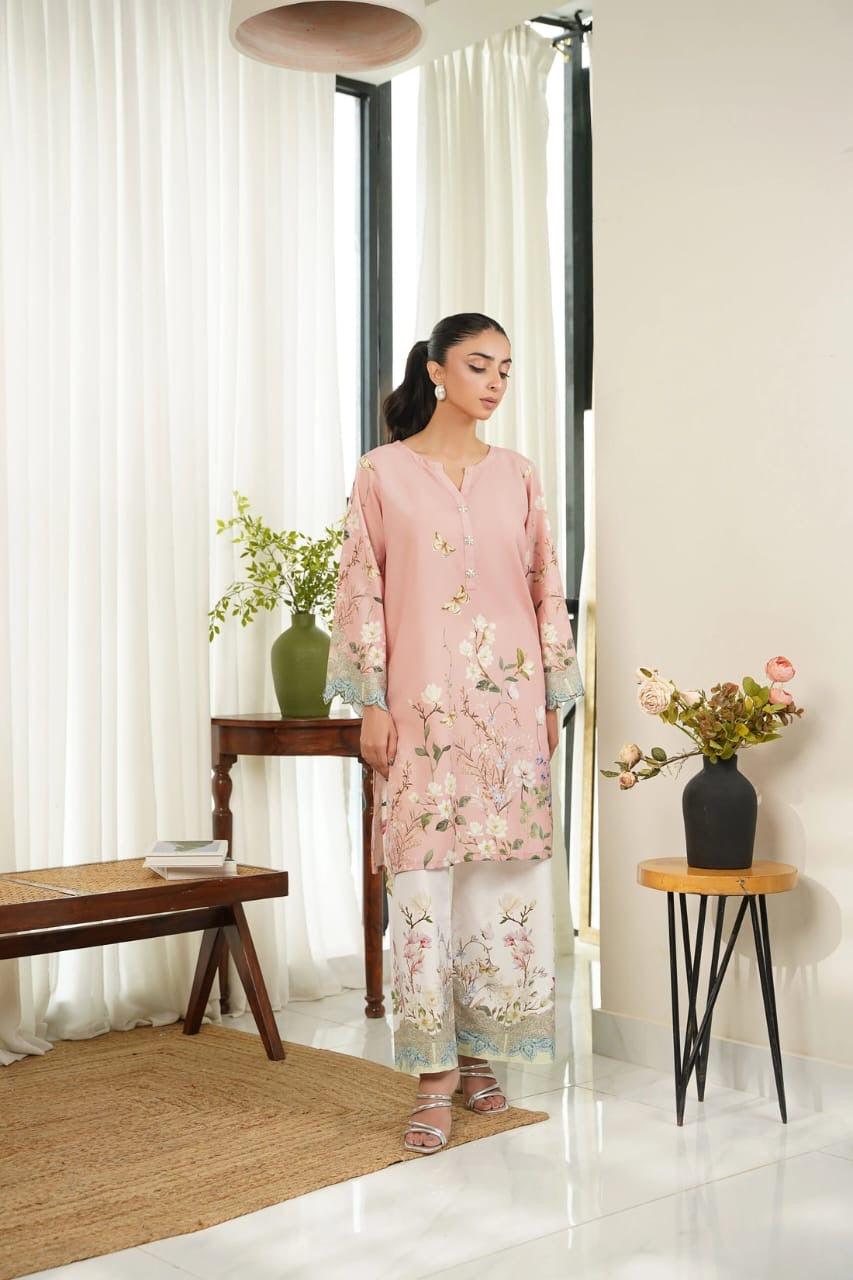 A graceful 2-piece ensemble in a soft blush pink hue, adorned with delicate floral prints and subtle butterfly accents. The straight-cut shirt features intricately embroidered lace-trim sleeves, paired with digitally printed trousers finished with a pastel blue border, creating an effortlessly elegant and feminine look.